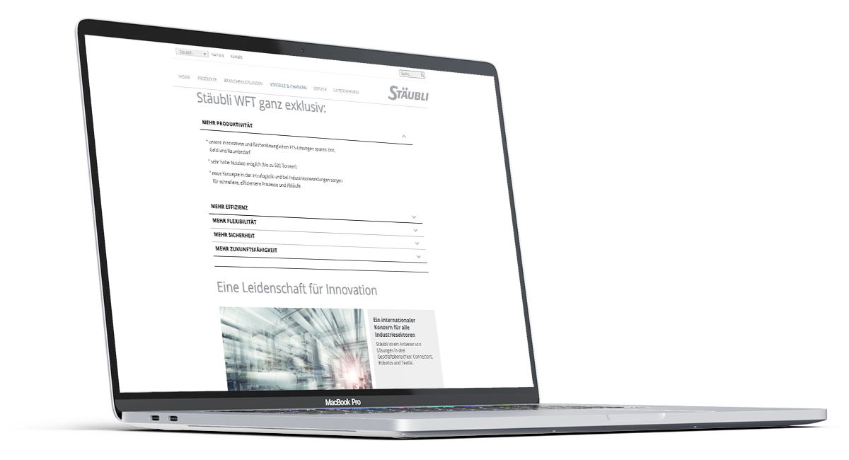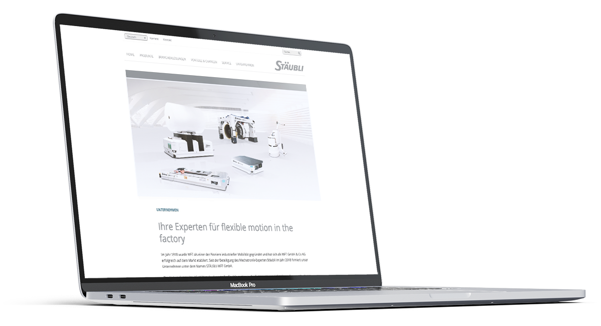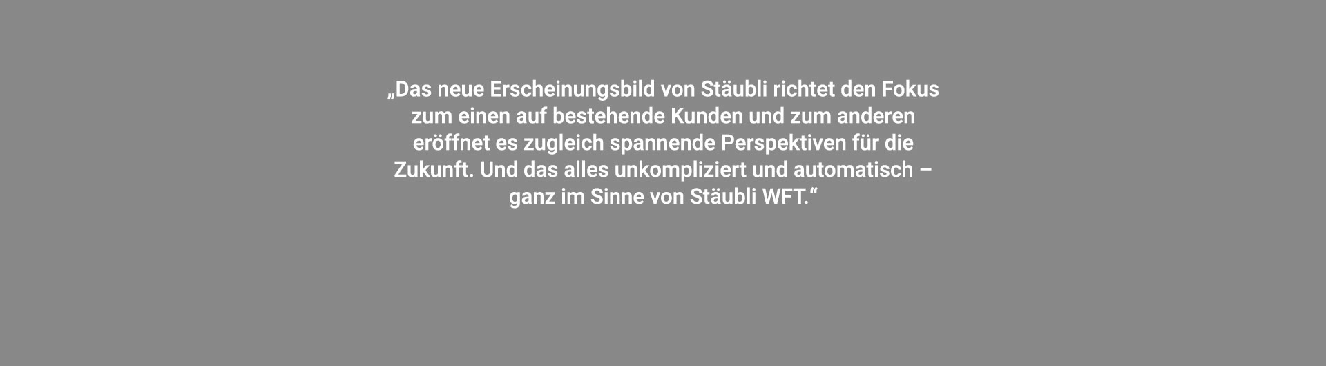 Als B2B Spezialisten haben wir den Zusammenschluss von Stäubli und WFT markenstrategisch und kommunikativ begleitet – angefangen bei der Neupositionierung bis zur Umsetzung der Content Creation mit ansprechenden Texten, bemerkenswerten Bildern und anspruchsvollen 3D-Animationen für Websites und Social Media Kanäle.