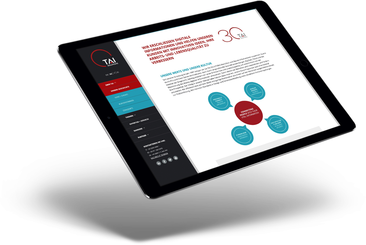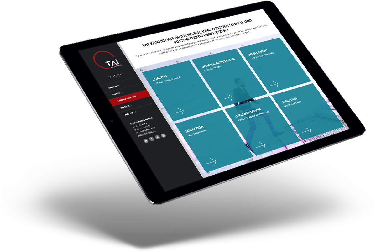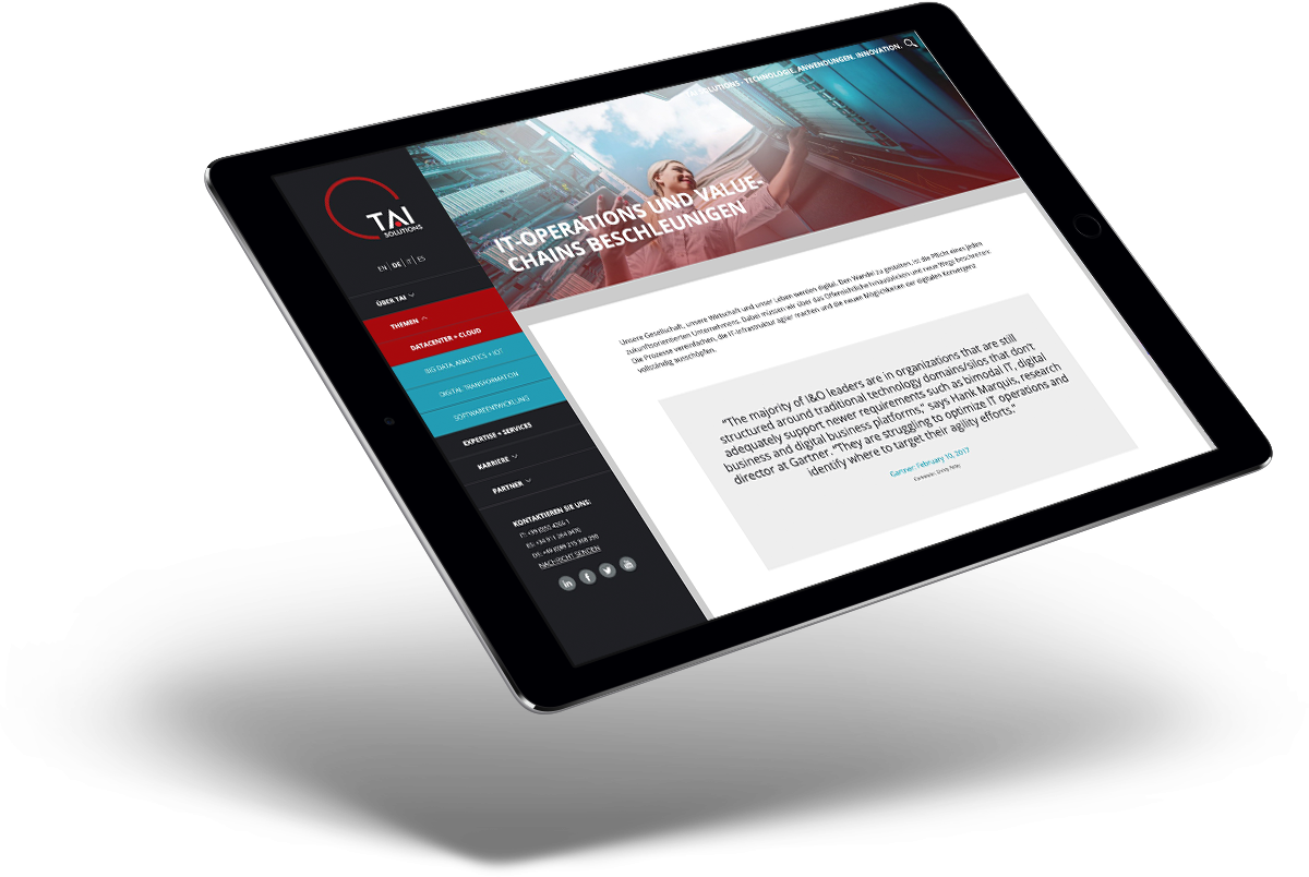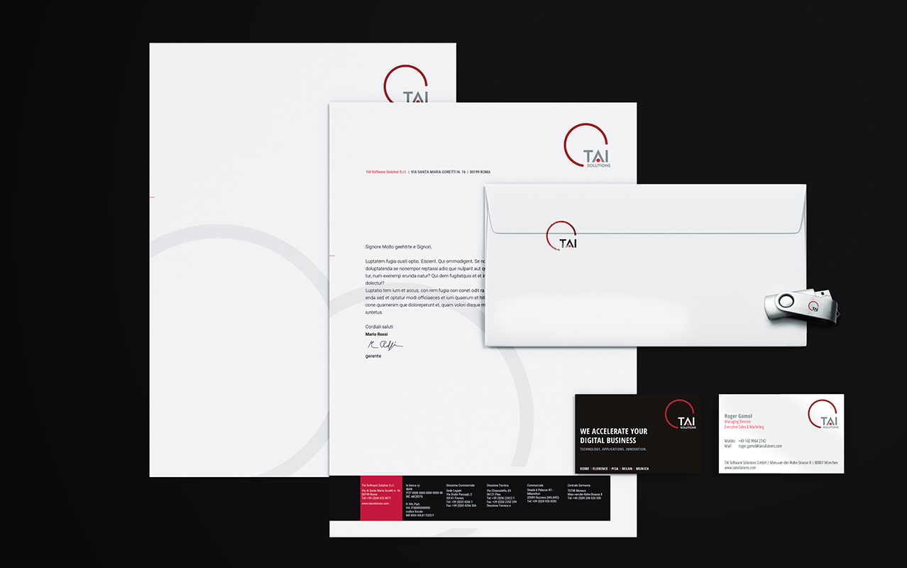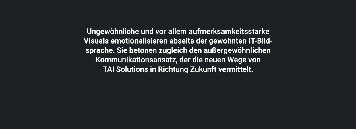 Der führende IT- und Digitalisierungsspezialist TAI Solutions expandiert international. Als B2B-Experten haben wir die Unternehmensmarke der italienischen Firma neu positioniert und dabei die Markenbotschaft präzisiert sowie ein durchgängiges Corporate Design geschaffen. Die visuelle Kommunikation vermittelt eindrucksvoll die zentralen Markenwerte. Und mit dem von uns neu konzipierten Webauftritt wächst TAI Solutions von Deutschland aus über sich hinaus.