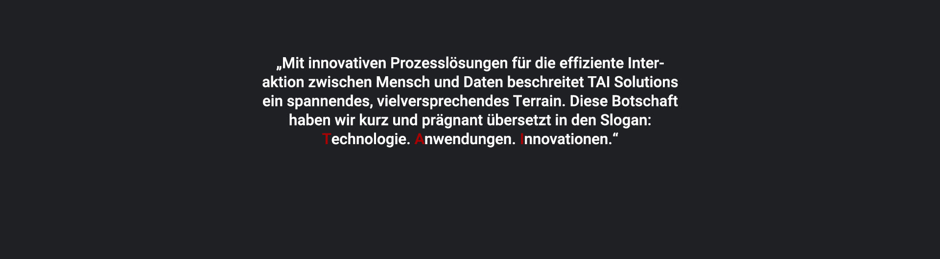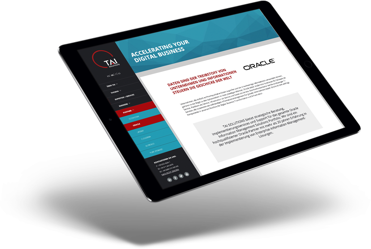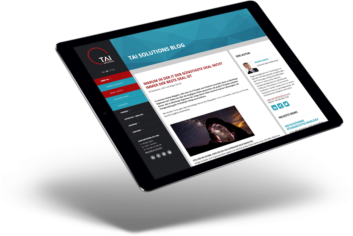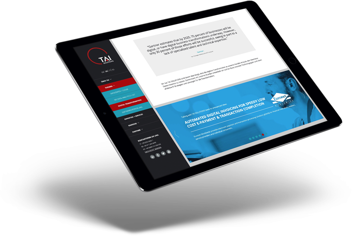 Der führende IT- und Digitalisierungsspezialist TAI Solutions expandiert international. Als B2B-Experten haben wir die Unternehmensmarke der italienischen Firma neu positioniert und dabei die Markenbotschaft präzisiert sowie ein durchgängiges Corporate Design geschaffen. Die visuelle Kommunikation vermittelt eindrucksvoll die zentralen Markenwerte. Und mit dem von uns neu konzipierten Webauftritt wächst TAI Solutions von Deutschland aus über sich hinaus.